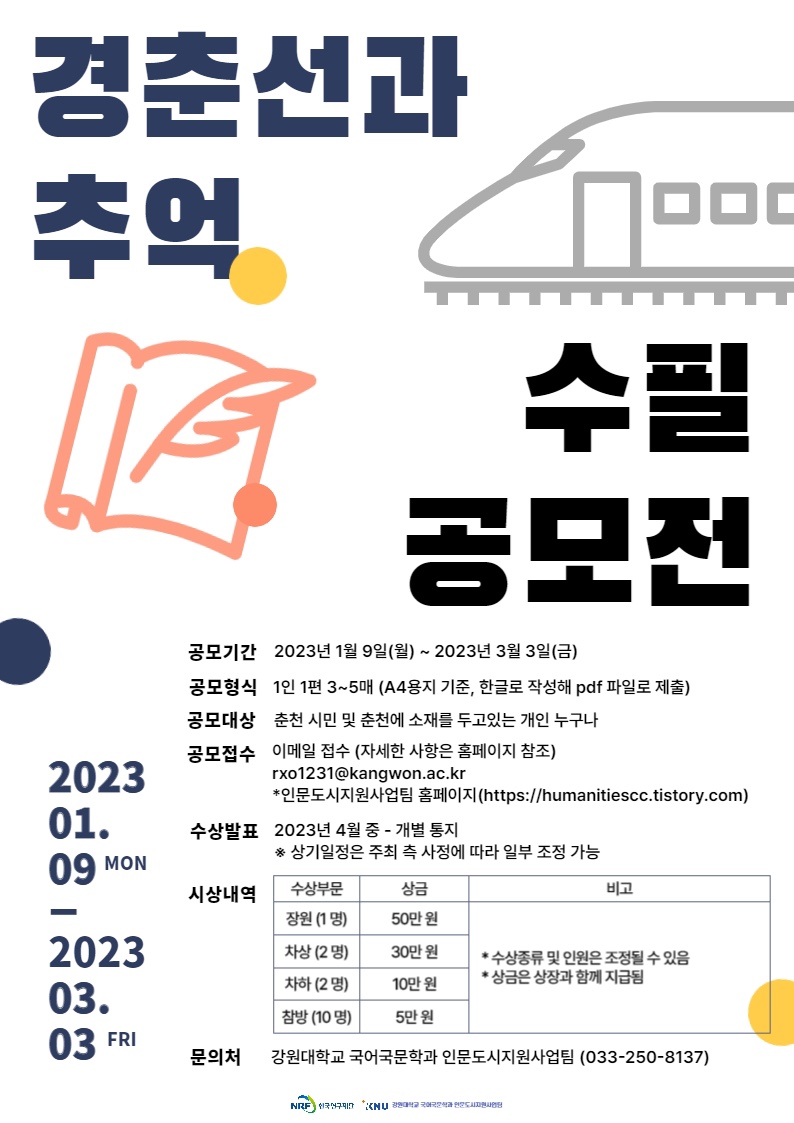 | 인문도시 춘천 ‘경춘선과 추억’ 사진 공모전 (0) | 2023.01.09 |