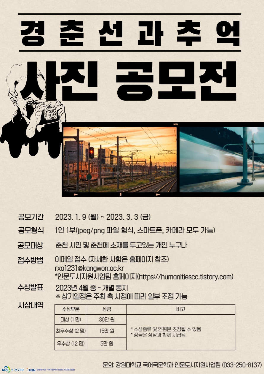 | 제2회 인문도시 춘천 ‘경춘선과 추억’ 사진 공모전 (0) | 2023.08.30 |