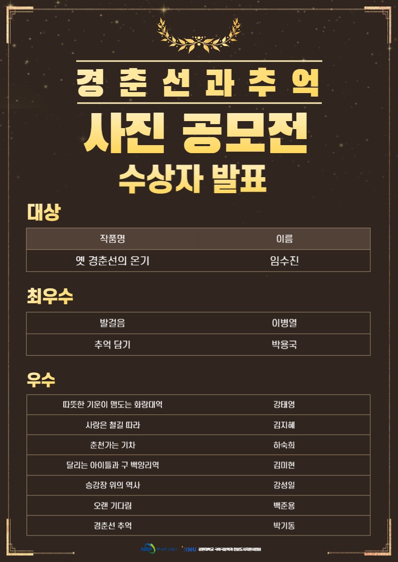 | 인문도시 춘천 ‘경춘선과 추억’ 사진 공모전 (0) | 2023.01.09 |